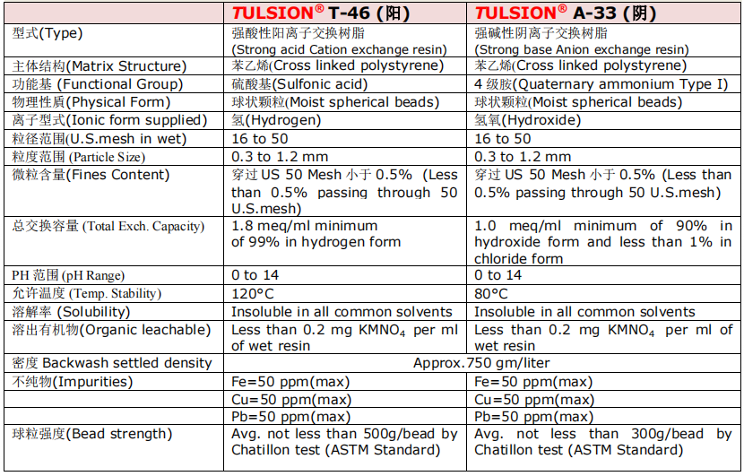 科海思采用超純水拋光樹(shù)脂MB-106UP,它是由核子級(jí)強(qiáng)酸型陽(yáng)離子Tulsimer ? T-46Li 及核子級(jí)強(qiáng)堿型陰離子 Tulsimer ? A-33OH 以1:2 體積比的劑量比例 , 預(yù)先混合的混床級(jí)離子交換樹(shù)脂,專門提供給超純水系統(tǒng)拋光用。它具有交換容量及優(yōu)越的物理特性。