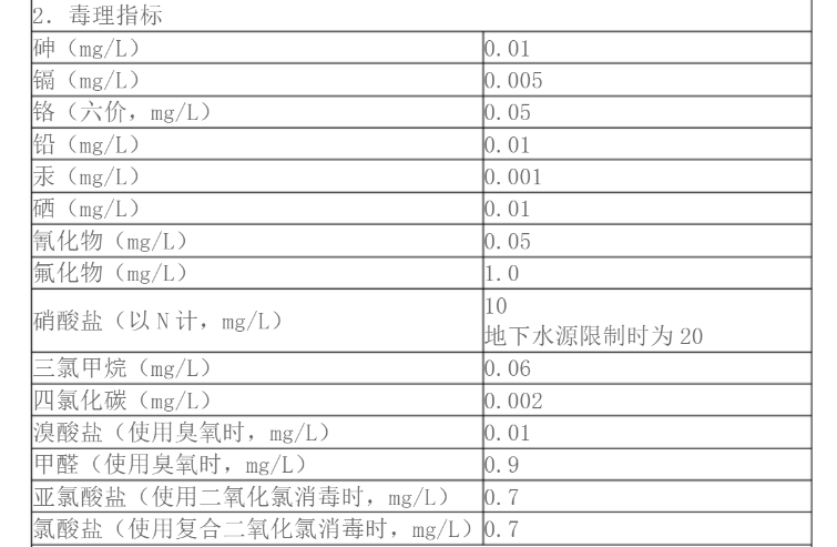 基于國內(nèi)的調(diào)查資料,并參考國外的研究報(bào)道,《生活飲用水衛(wèi)生標(biāo)準(zhǔn)》GB5749-2006將飲用水中的硝酸鹽氮含量不得超過10mg/L,砷的含量小于0.01mg/l。