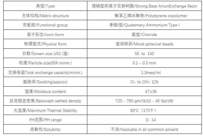 Tulsimer?A-853E是一款包含季胺I型官能團的聚苯乙烯架構的“堅韌膠凝體”強堿型陰離子交換樹脂。