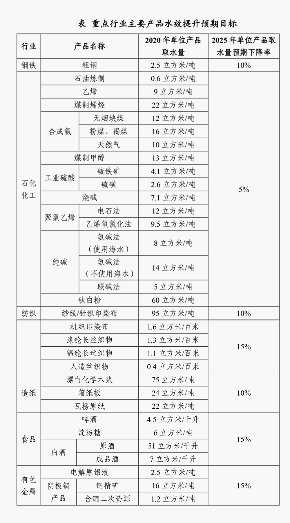 重點(diǎn)用水行業(yè)水效進(jìn)一步提升,鋼鐵行業(yè)噸鋼取水量、造紙行業(yè)主要產(chǎn)品單位取水量下降10%,石化化工行業(yè)主要產(chǎn)品單位取水量下降5%,紡織、食品、有色金屬行業(yè)主要產(chǎn)品單位取水量下降15%。