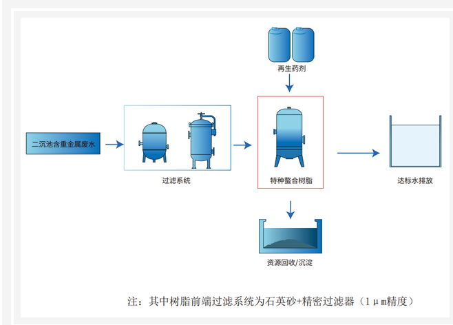以重金屬廢水為例,針對特定重金屬離子的特點,科海思工業(yè)廢水處理解決方案,利用螯合樹脂(CH-90Na)的特種功能基團與重金屬離子形成絡(luò)合物的特性,從而實現(xiàn)重金屬離子的回收利用及深度去除。